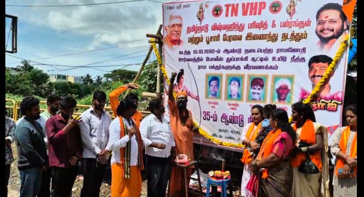 கிருஷ்ணகிரி மாவட்டம், தேன்கனிக்கோட்டை யில் கடந்த 10:10:1990 யில் நடைபெற்ற ராமஜோதி ஊர்வலத்தில் போலீஸ் துப்பாக்கிச் சூட்டில் வீர மரணம் அடைந்தவர்களுக்கு, தமிழ்நாடு விஸ்வ ஹிந்து பரிசத் சார்பில் வீரவணக்க நிகழ்வு இன்று ஓசூர் பண்டா ஆஞ்சநேயர் கோவில் எதிரில் நடத்தப்பட்டது.