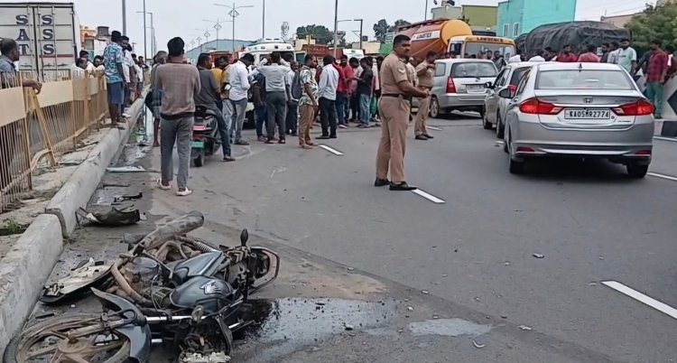திருப்பத்தூர் மாவட்டம், ஆம்பூர் அடுத்த சான்றோர்குப்பம் பகுதி பெங்களூர் - சென்னை தேசிய நெடுஞ்சாலையில் ஜோலார்பேட்டையில் இருந்து வேலூர் நோக்கிச்சென்ற கார் திடீரென ஓட்டுநரின் கட்டுப்பாட்டை இழந்து சாலையில் தாறுமாறாக ஓடி, முன்னால் சென்றுகொண்டிருந்த இருசக்கர வாகனம் மீது மோதி விபத்துக்குள்ளானது.