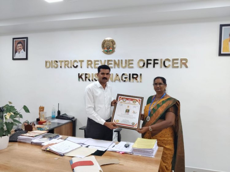 பெற்ற சாந்தி கிருஷ்ணகிரி மாவட்ட ஆட்சியர் தினேஷ் குமார் தனது பாராட்டுக்களையும் வாழ்த்துக்களையும் தெரிவித்தார்.
