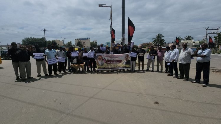 உச்ச நீதிமன்ற நீதிபதி மாண்புமிகு ஆர்.பி.கவாய் அவர்கள் மீது செருப்பு வீச முயன்ற ஆர் எஸ் எஸ் மதவெறி மனப்பான்மை கொண்ட கயவனை கண்டித்து கிருட்டினகிரி மாவட்டம், ஒசூர் மாவட்ட திராவிடர் கழகம் சார்பில் ஓசூர் தந்தை பெரியார் சதுக்கம் அருகில் கண்டன ஆர்ப்பாட்டம் நடைபெற்றது.