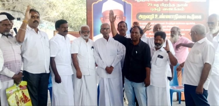 ஐயா பழ. நெடுமாறன் அவர்கள், உலகத் தமிழர்கள் பேரமைப்பின் தலைவர், மதுஒழிப்பு போராளி சசிபெருமாள் 71- வது பிறந்தநாளில், காந்தியவாதி சசிபெருமாள் ஆதரவு மதுஒழிப்பு போராளிகள் வீ. சுந்தர் ஒருங்கிணைப்பில் 20-2-2026 அன்று சென்னை திருவல்லிக்கேணி சிவானந்தா சாலையில் நடைபெற்ற அறவழி உண்ணாநிலை போராட்டத்தை துவக்கி வைத்து, தமிழகத்தில் பூரண மதுவிலக்கை வலியுறுத்தி உரையாற்றினார்.