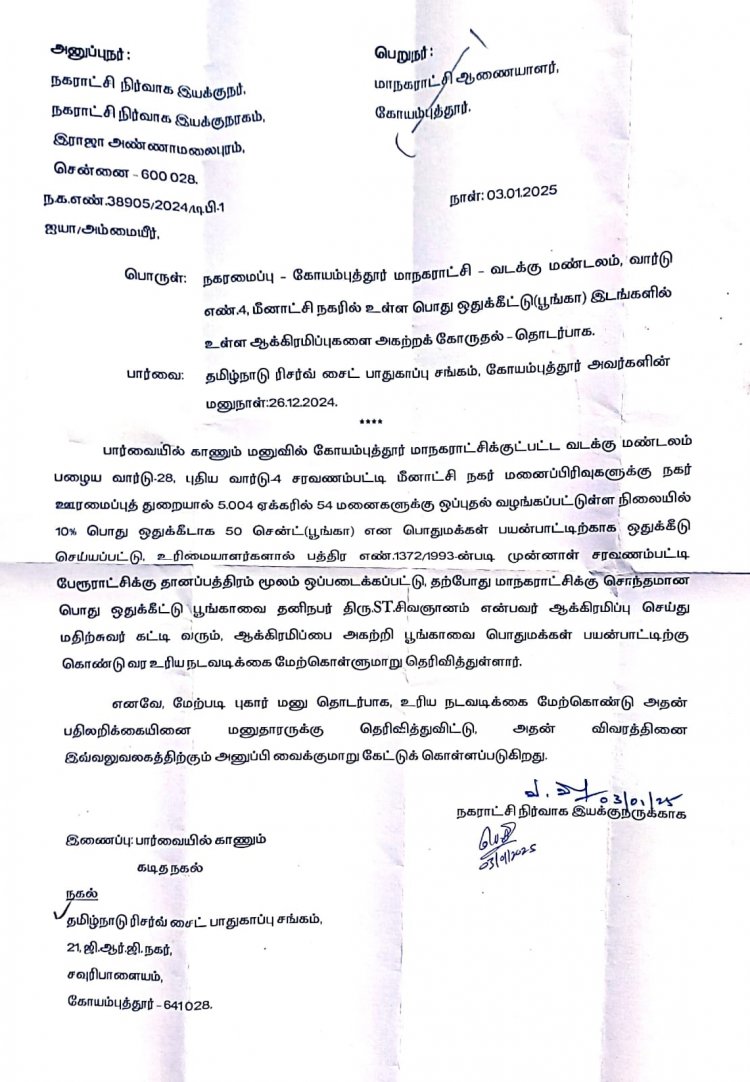 இது தொடர்பாக, கோவை மாநகராட்சி ஆணையருக்கு புகார் மனு அனுப்பப்பட்டுள்ள நிலையில், நீதிமன்ற தீர்ப்பை மதித்து உடனடியாக ஆக்கிரமிப்பை அகற்றி, பூங்கா நிலத்தை பொதுமக்கள் பயன்பாட்டிற்கு கொண்டு வரவேண்டும் என பொதுமக்கள் கோரிக்கை விடுத்துள்ளனர்.